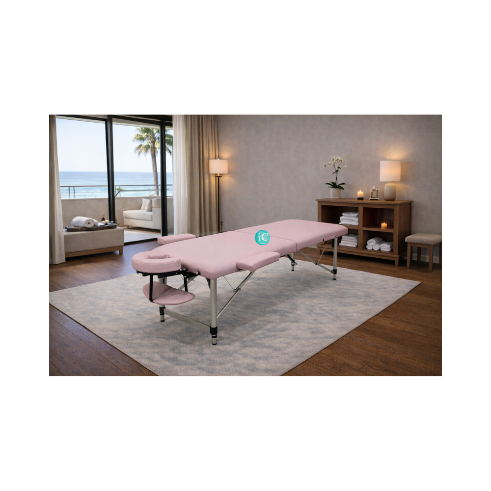 Icosmetics Alu 2 φορητό κρεβάτι αλουμινίου με θήκη μεταφοράς, αποσπώμενο προσκέφαλο με μαξιλαράκι και πλευρικά εξαρτήματα.