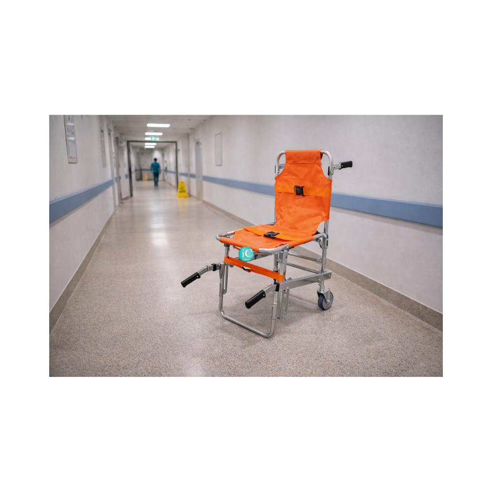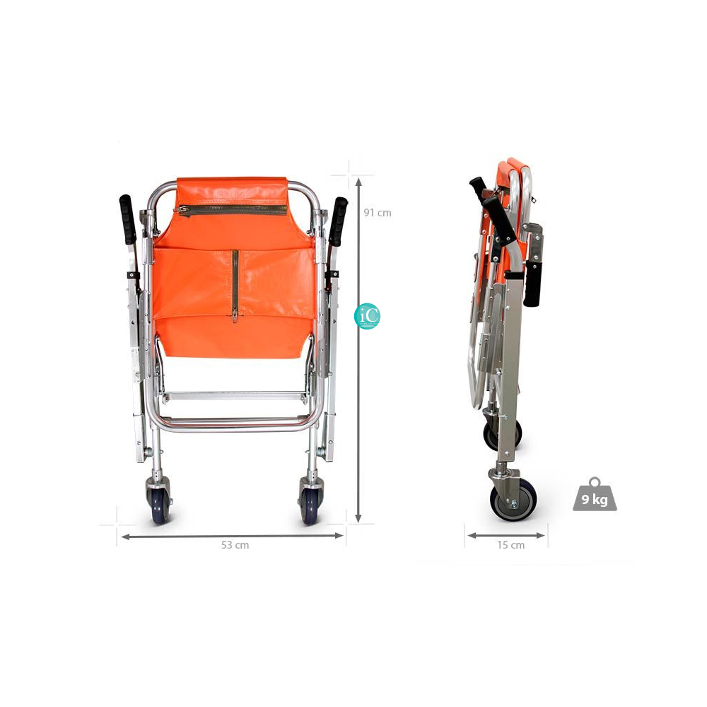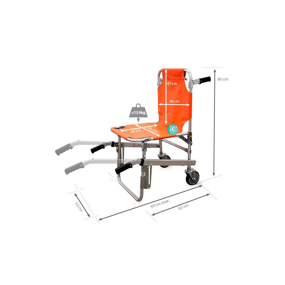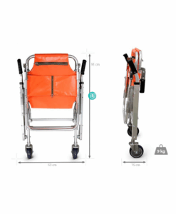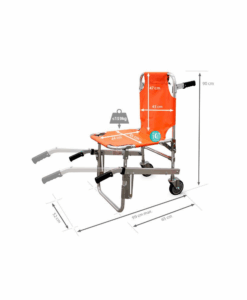 Πτυσσόμενη καρέκλα εκκένωσης αλουμινίου. Σχεδιασμένη για να βοηθά το προσωπικό έκτακτης ανάγκης σε καταστάσεις εκκένωσης και διάσωσης. Εξοπλισμένο με τηλεσκοπικές, πτυσσόμενες λαβές, τροχούς και ζώνες στερέωσης με σύστημα γρήγορης απελευθέρωσης.