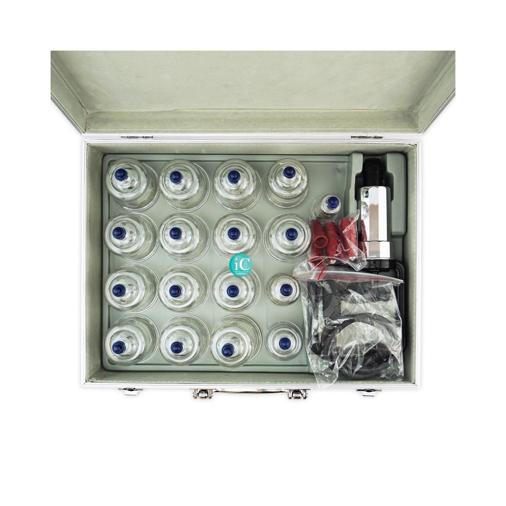 Σετ βεντούζες 17τμχ τοποθετημένες σε μεταλλικό βαλιτσάκι. Περιλαμβάνεται επίσης μία αντλία αναρρόφησης, 6 μαγνήτες και σωλήνας επέκτασης.
