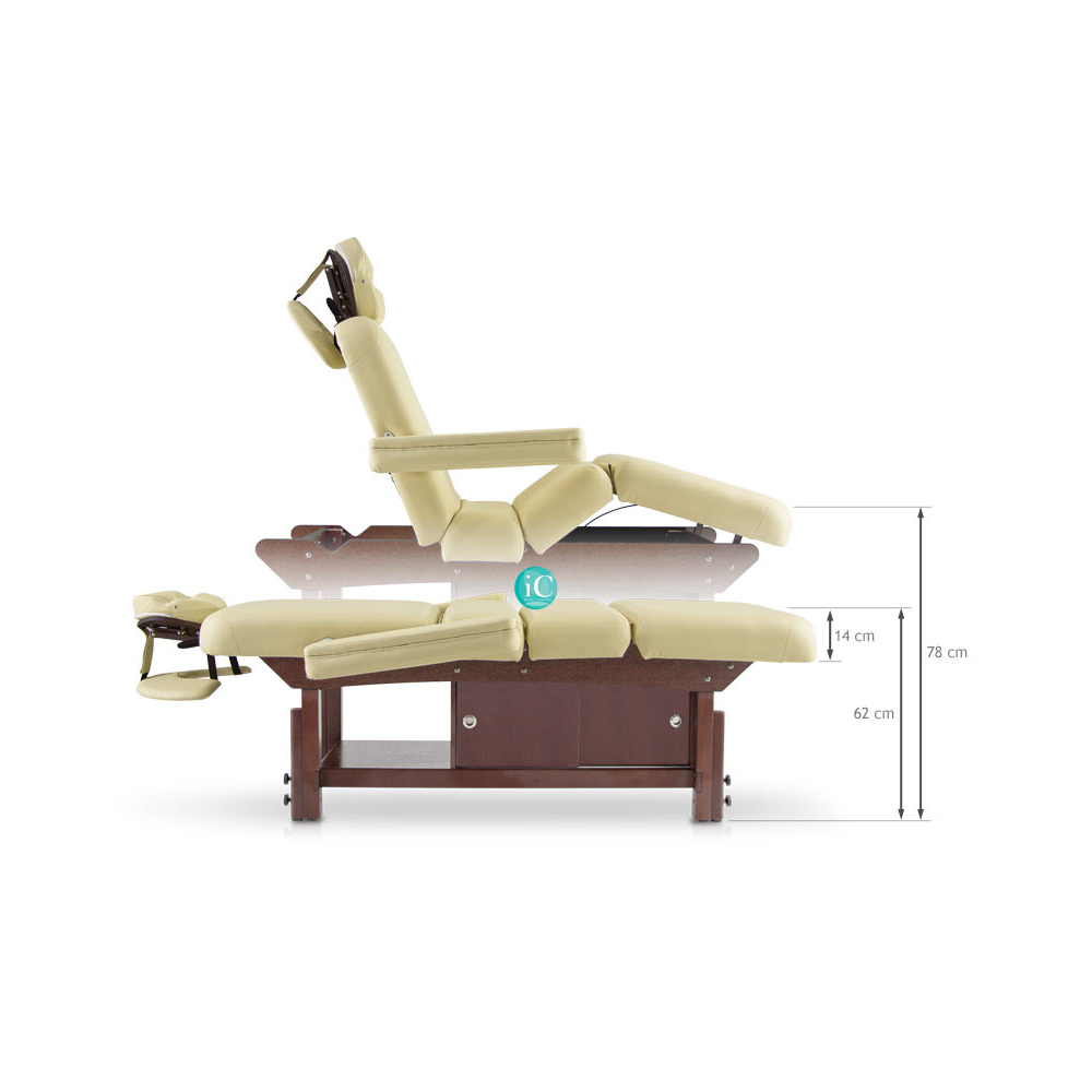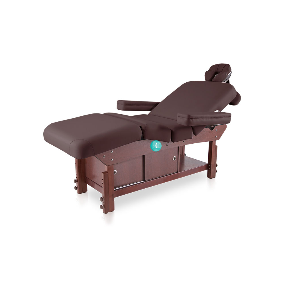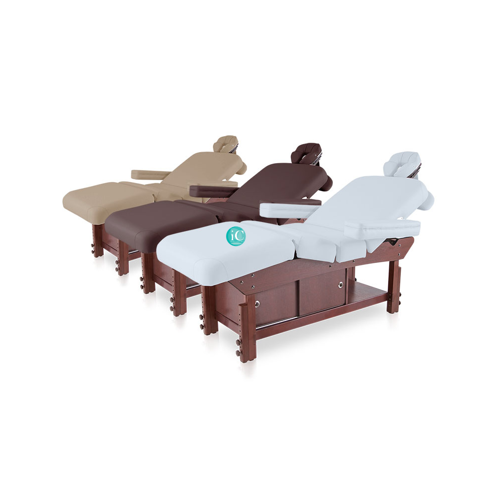 Σταθερό κρεβάτι αισθητικής spa 3 τμημάτων, υψηλής ποιότητας και αισθητικής, με ξύλινη ανθεκτική και σταθερή βάση σε χρώμα wenge, χώρο αποθήκευσης με συρόμενες πόρτες κάτω από το κρεβάτι και ρυθμιζόμενο ύψος ποδιών. Διαθέτει επίσης ρυθμιζόμενη ανάκλιση πλάτης, πλευρικά εξαρτήματα, αποσπώμενο προσκέφαλο και δίσκο τοποθέτησης χεριών. Η ταπετσαρία του πάχους 14cm είναι πραγματικά ανθεκτική και προσφέρει στους πελάτες σας την άνεση και τη χαλάρωση που αξίζουν.