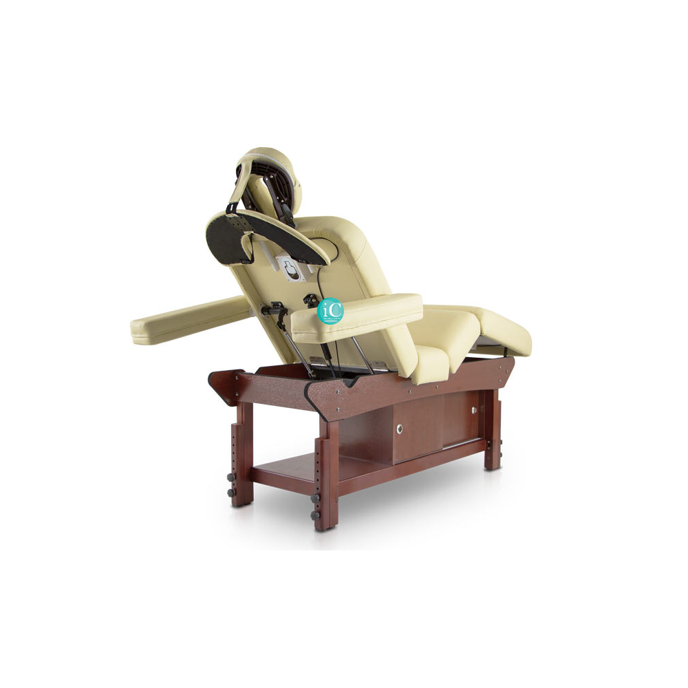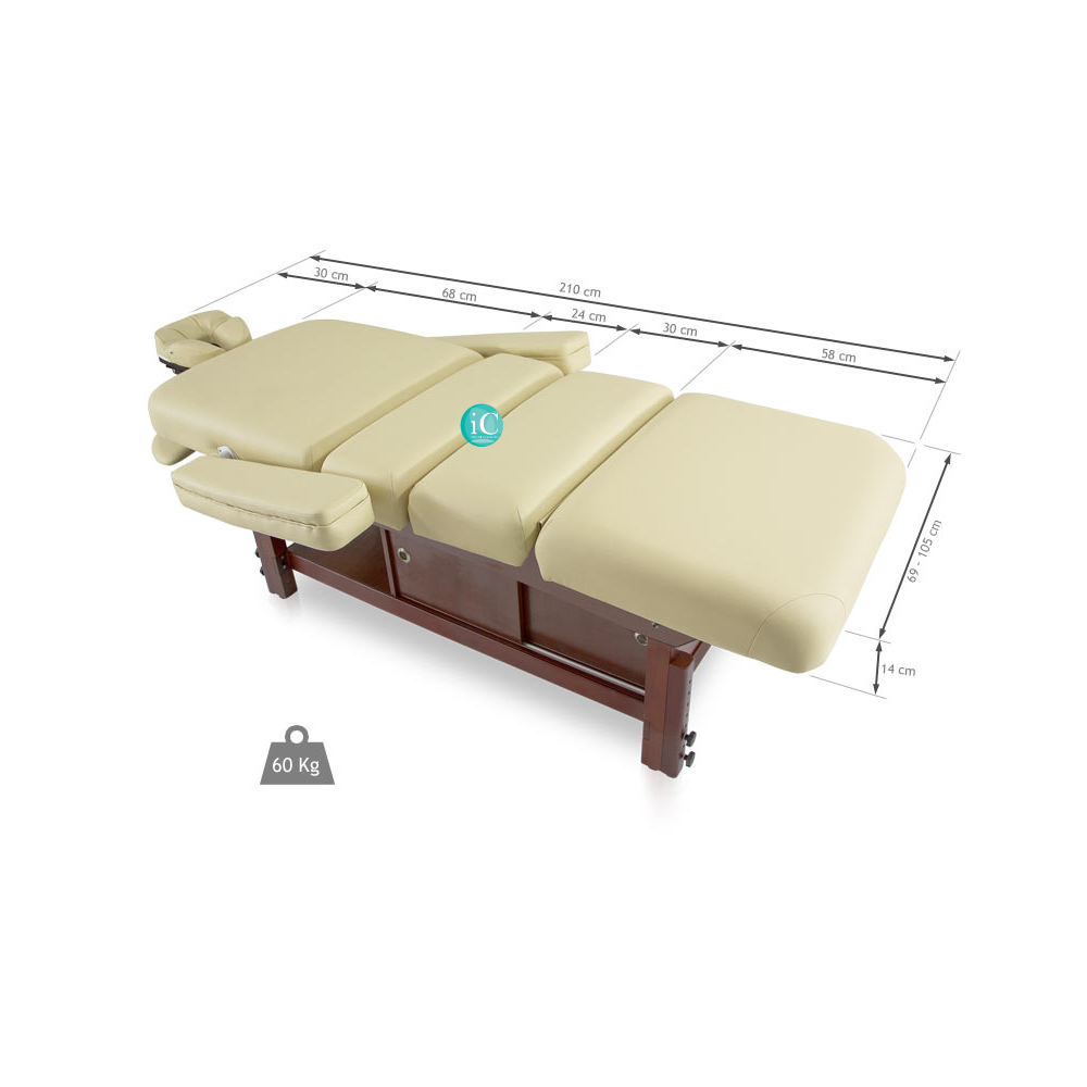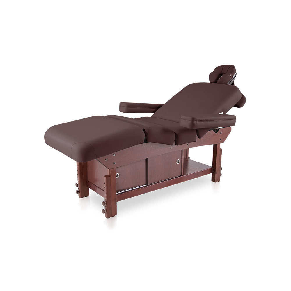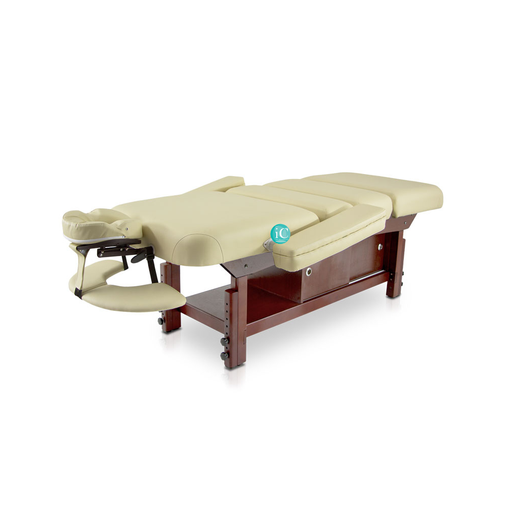 Σταθερό κρεβάτι αισθητικής spa 3 τμημάτων, υψηλής ποιότητας και αισθητικής, με ξύλινη ανθεκτική και σταθερή βάση σε χρώμα wenge, χώρο αποθήκευσης με συρόμενες πόρτες κάτω από το κρεβάτι και ρυθμιζόμενο ύψος ποδιών. Διαθέτει επίσης ρυθμιζόμενη ανάκλιση πλάτης, πλευρικά εξαρτήματα, αποσπώμενο προσκέφαλο και δίσκο τοποθέτησης χεριών. Η ταπετσαρία του πάχους 14cm είναι πραγματικά ανθεκτική και προσφέρει στους πελάτες σας την άνεση και τη χαλάρωση που αξίζουν.